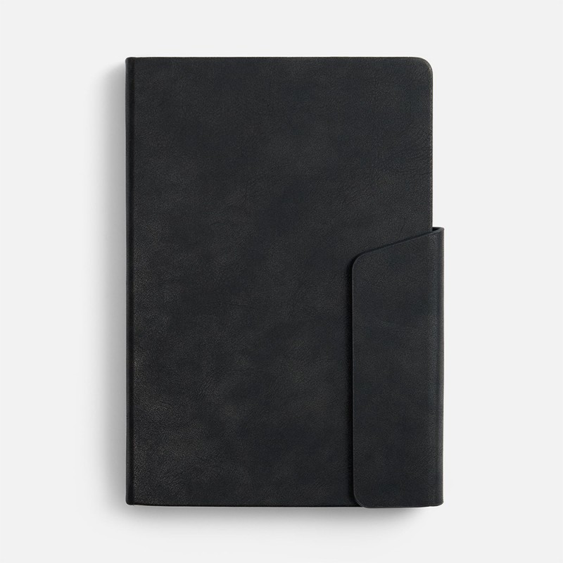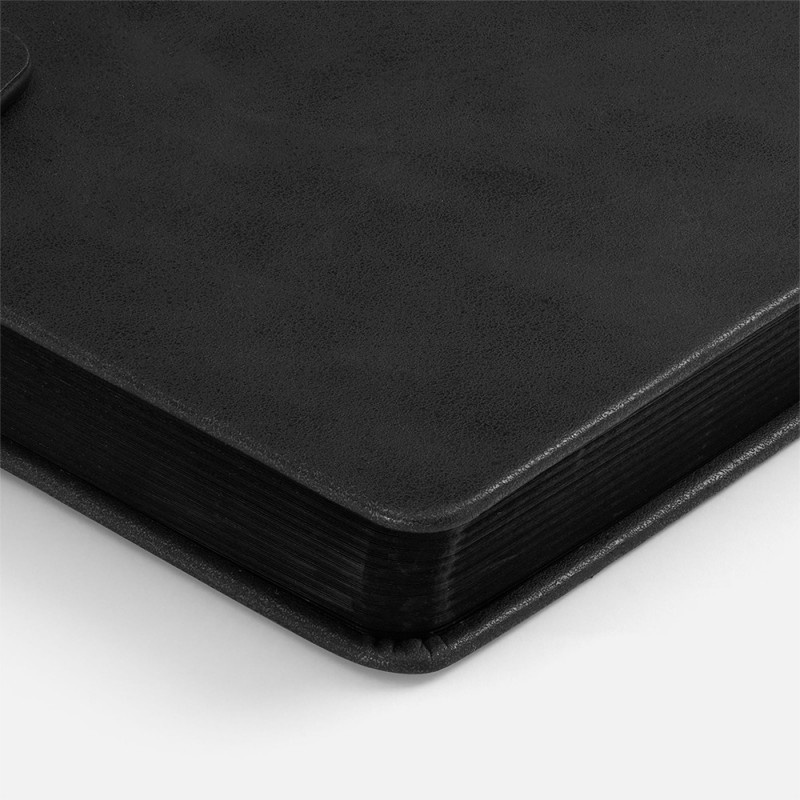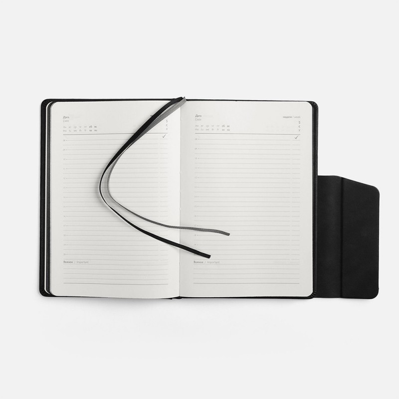Этот ежедневник предлагает идеальный баланс формы и содержания: элегантная черная обложка с надежным магнитным клапаном, прошитый корешок (каптал) и два удобные ляссе. Внутри вас ждет просторный блок на 320 страниц из качественной тонированной бумаги и встроенный справочник.