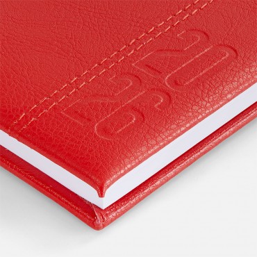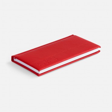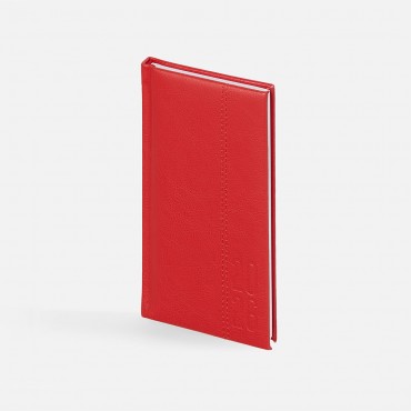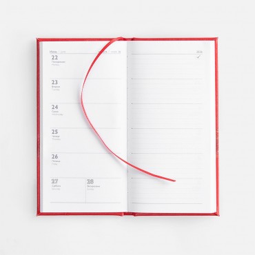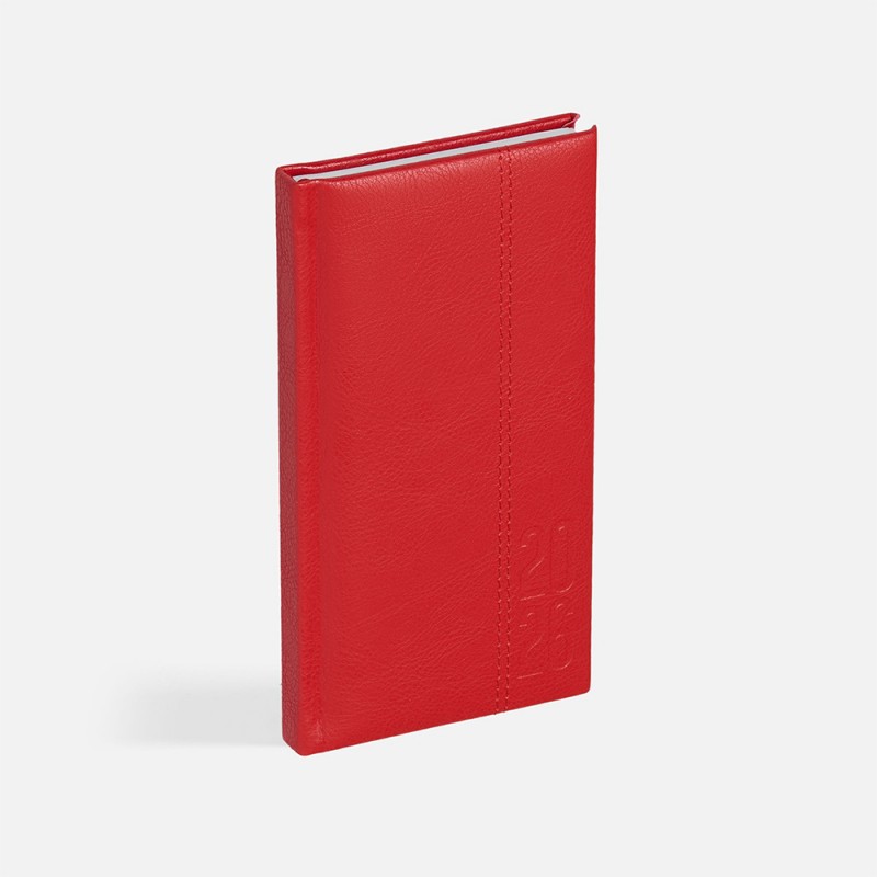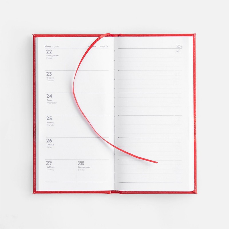 Еженедельник формата А6 с твердой обложкой с поролоном из искусственной кожи Sarif красного цвета, дополнен декоративной строчкой и тиснением года на обложке. Каптал и ляссе в цвет обложки. Блок c календарной сеткой и справочными материалами. Датирован на 2026 год.