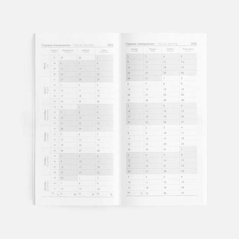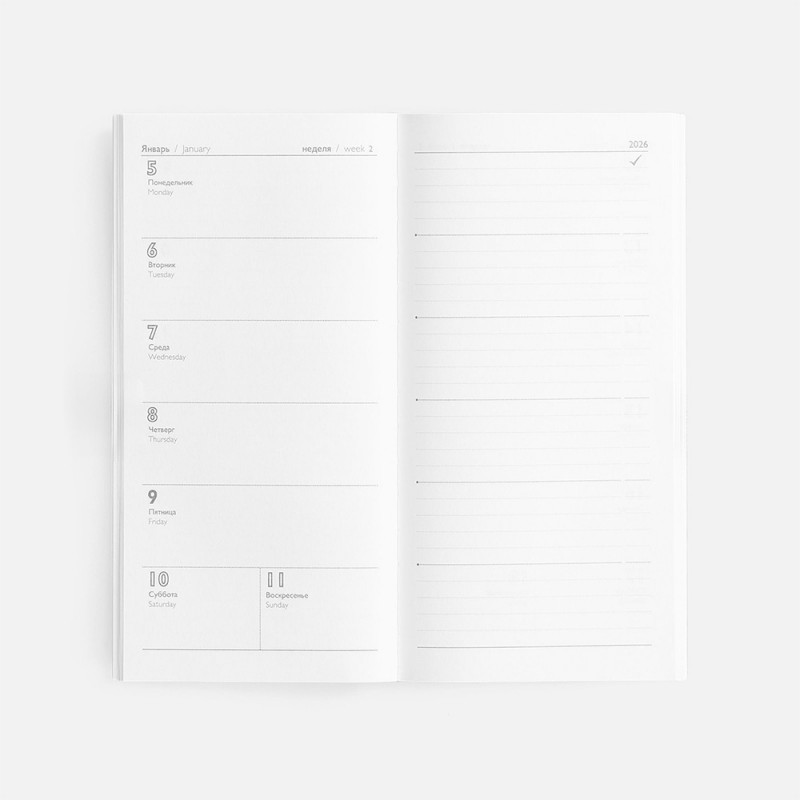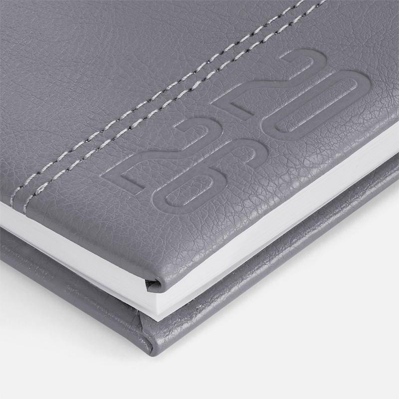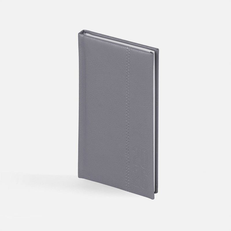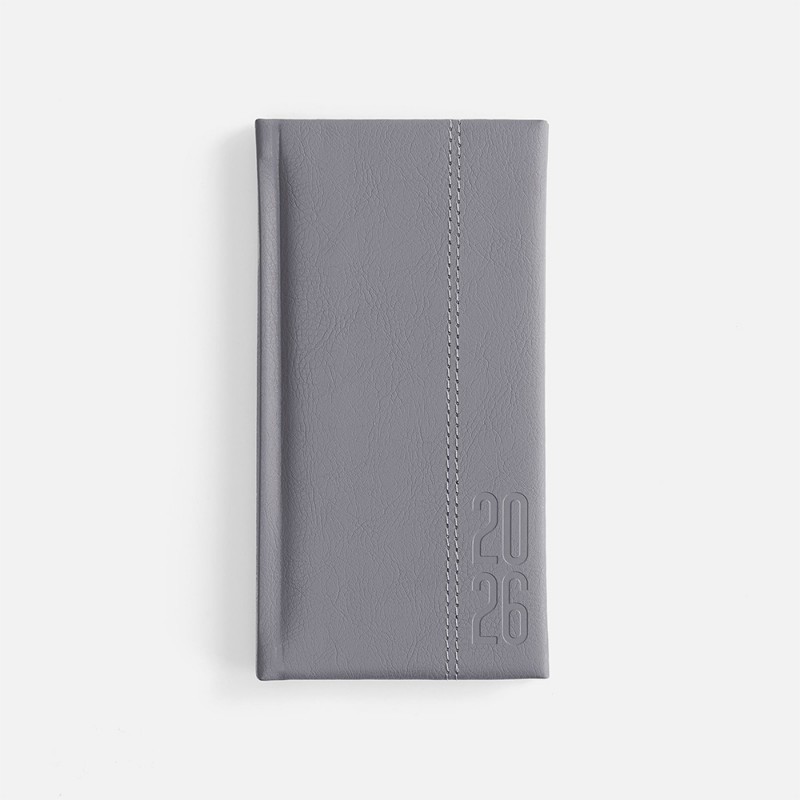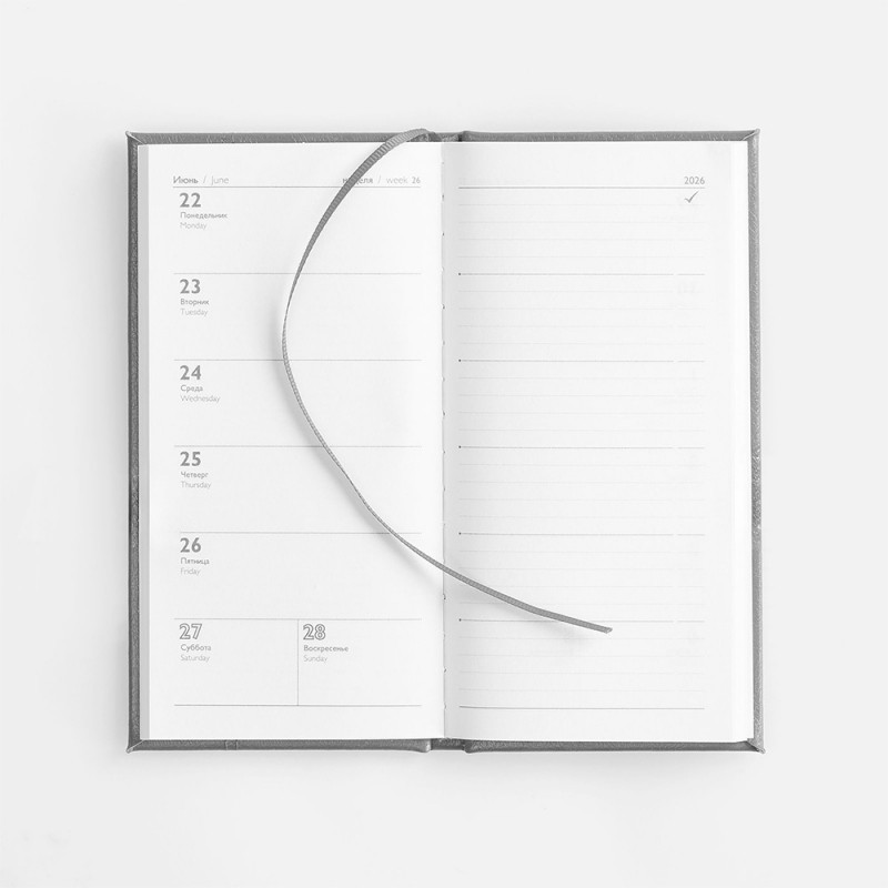 Еженедельник с твердой обложкой с поролоном из искусственной кожи Sarif серого цвета, дополнен декоративной строчкой и тиснением года на обложке. Каптал и ляссе в цвет обложки. Блок c календарной сеткой и справочными материалами. Датирован на 2026 год.