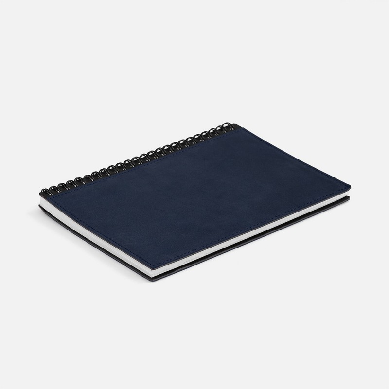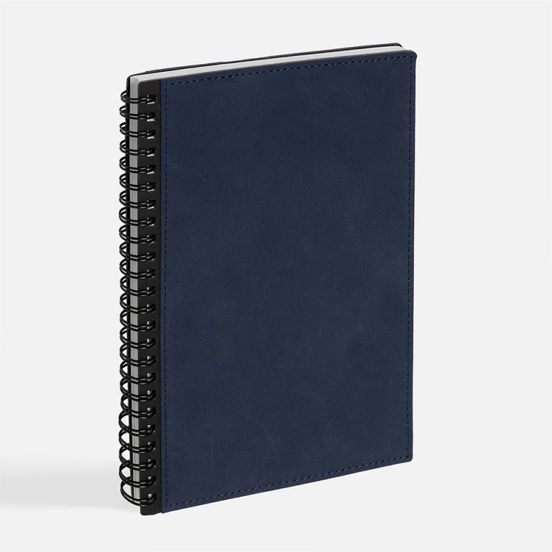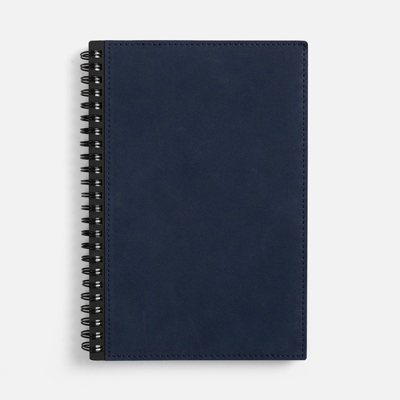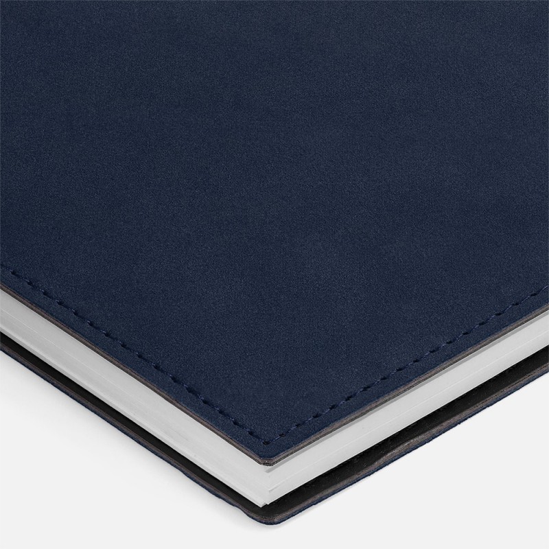 Ежедневник с интегральным переплётом и обстрочкой по периметру на открытой пружине. Обложка из искусственной кожи синего цвета, имитирующей замшу.
