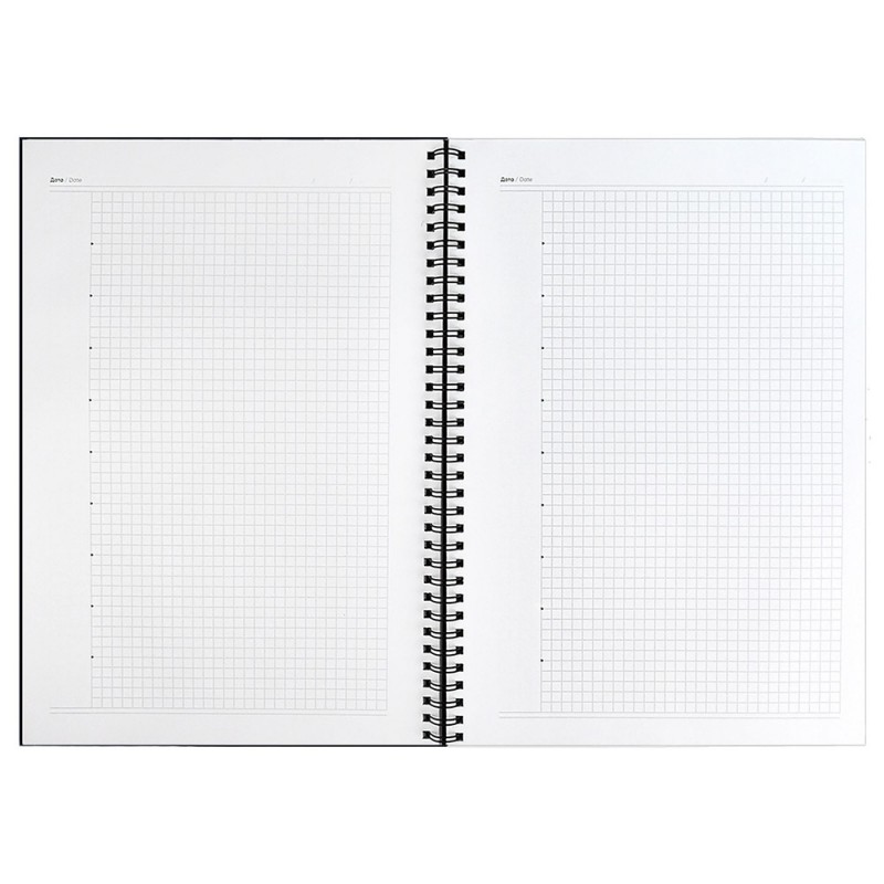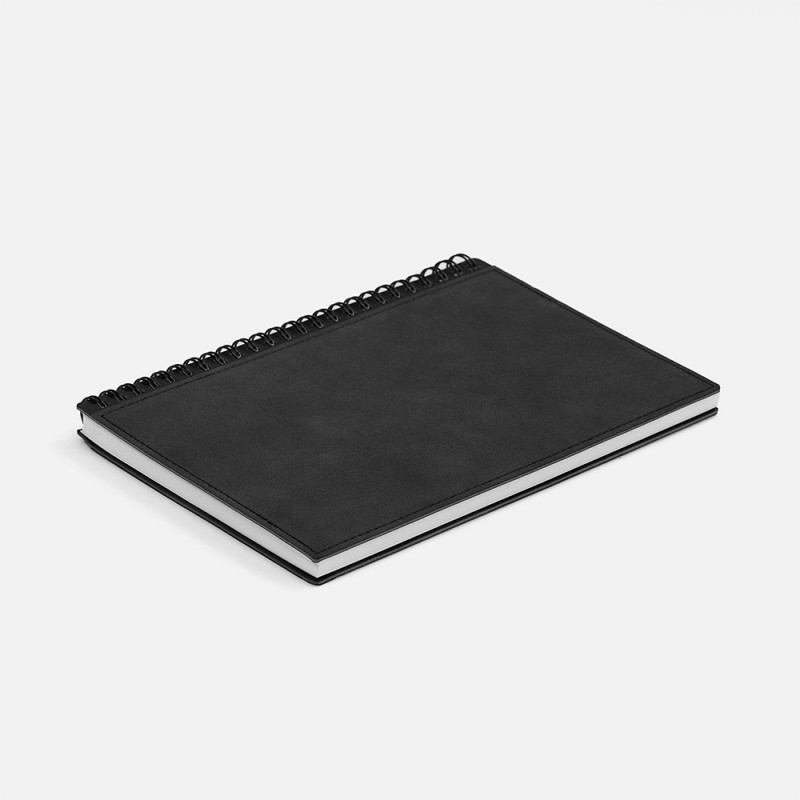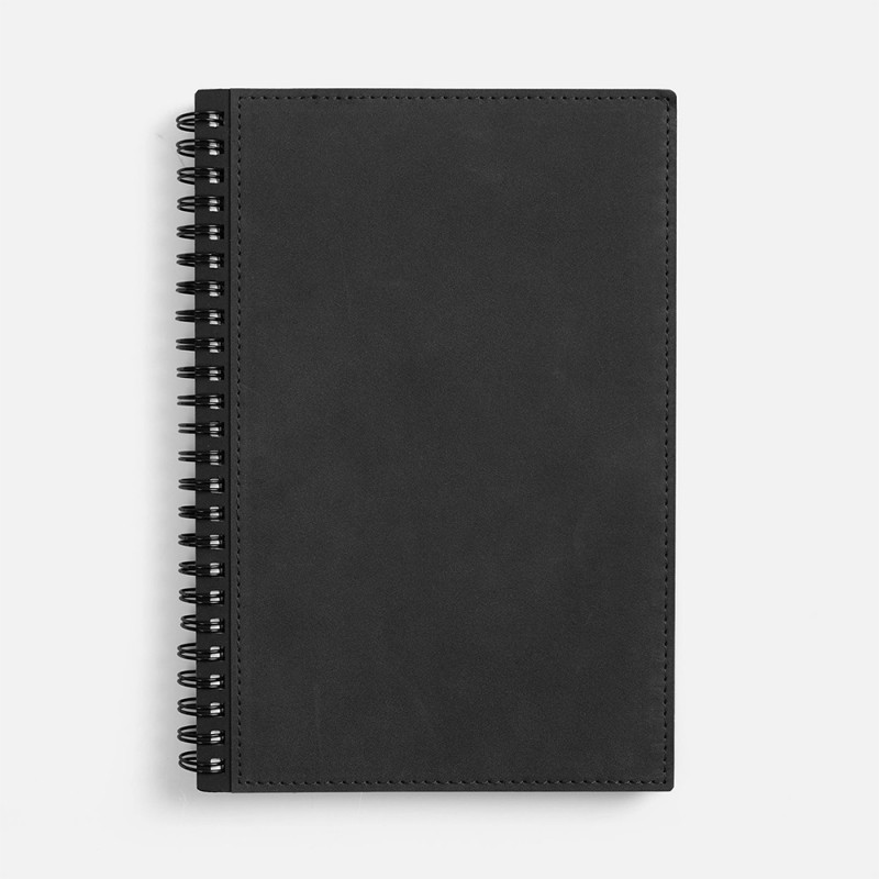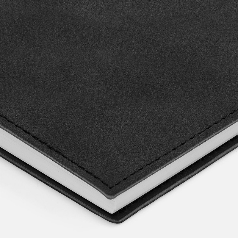 Ежедневник с интегральным переплётом и обстрочкой по периметру на открытой пружине. Обложка из искусственной кожи черного цвета, имитирующей замшу.