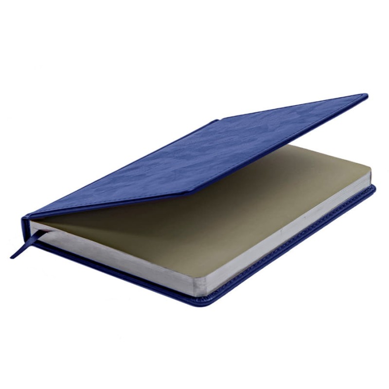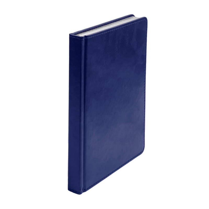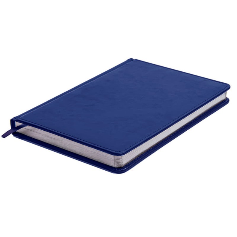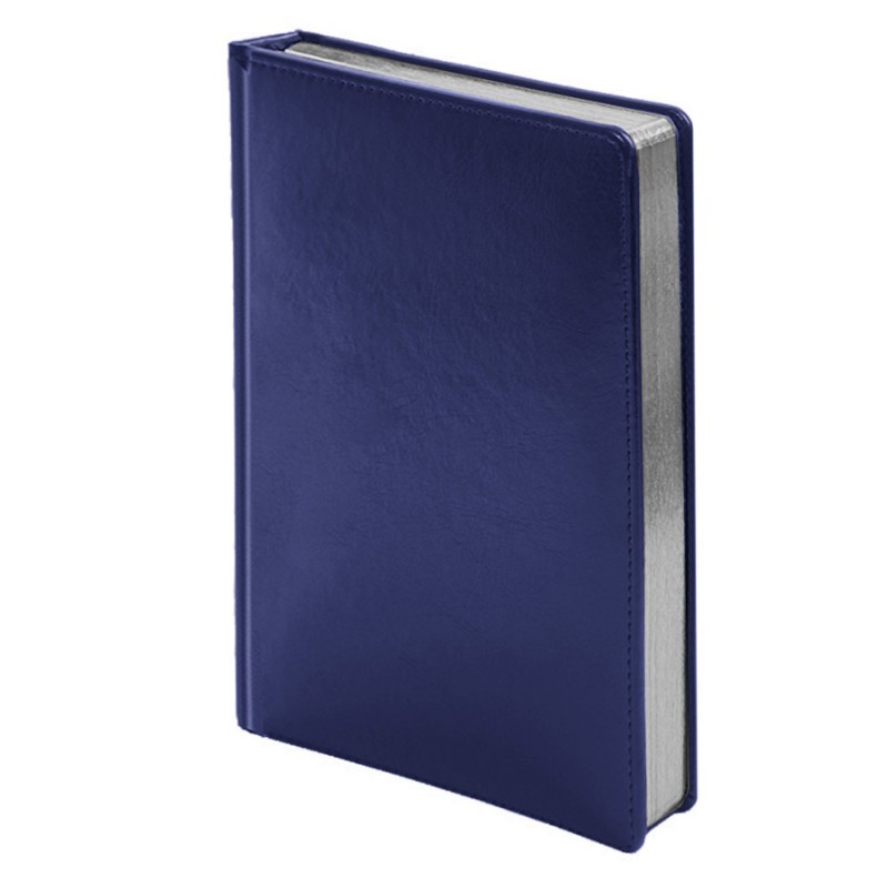 Классический ежедневник в твердой обложке с прошивкой по краю. Обложка изготовлена из кожзама Nebraska синего цвета, обладающего приятной на ощупь поверхностью и недатированным блоком с серебряным срезом. Каптал и ляссе в цвет обложки.