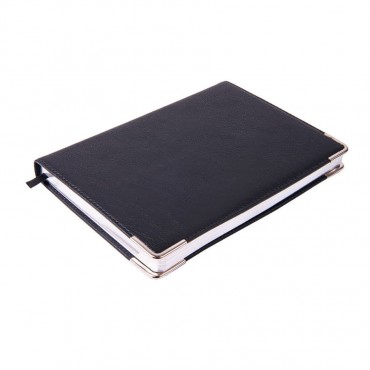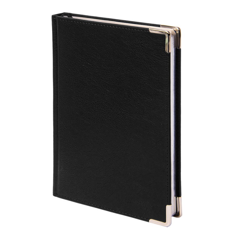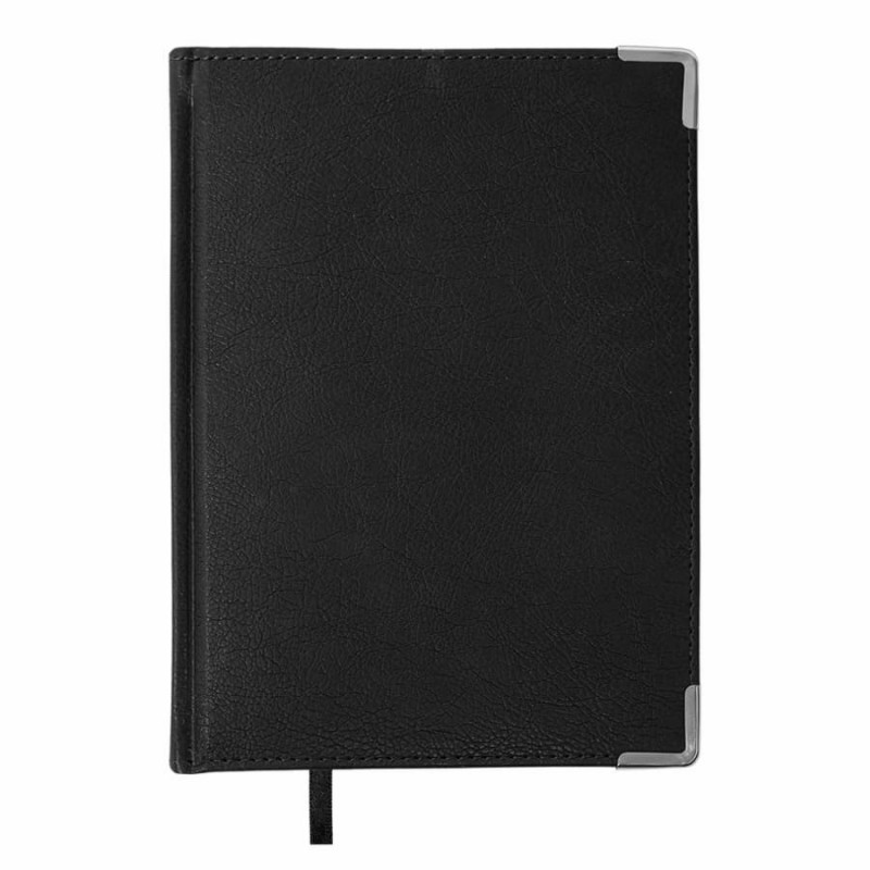 Классический ежедневник в твердом переплете. Обложка изготовлена из искусственного материала черного цвета, иммитирующего фактуру натуральной кожи. Прошивка по периметру. Серебристые уголки и обрез. Недатированный блок. Упакован ежедневник в прозрачный полибэг.