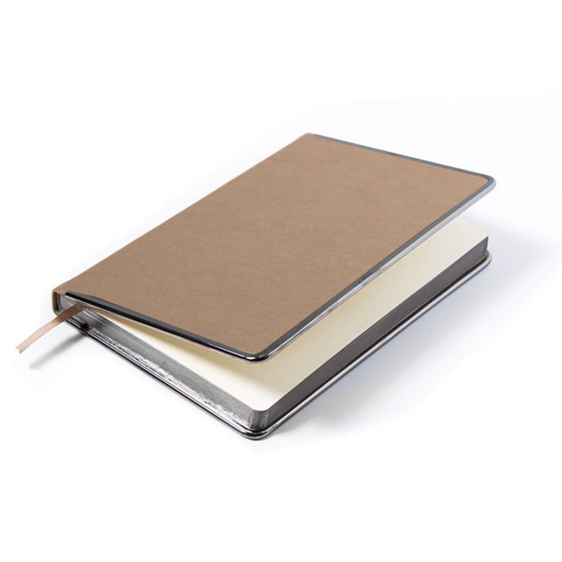Классический ежедневник в твердом переплете. Обложка выполнена из искусственного материала светло-коричневого цвета, имитирующего фактуру натуральной кожи. Металлическая окантовка по периметру. Обрез в цвет окантовки. Недатированный блок. Упакован ежедневник в крафтовый сливбокс.