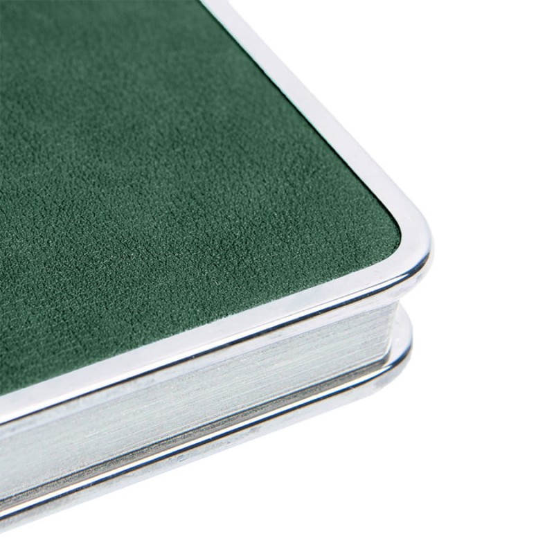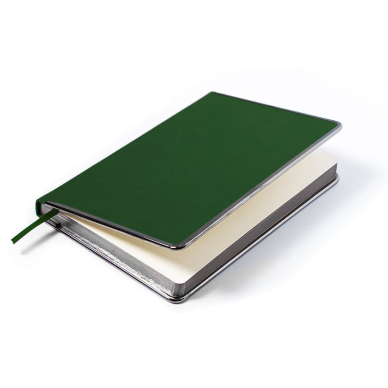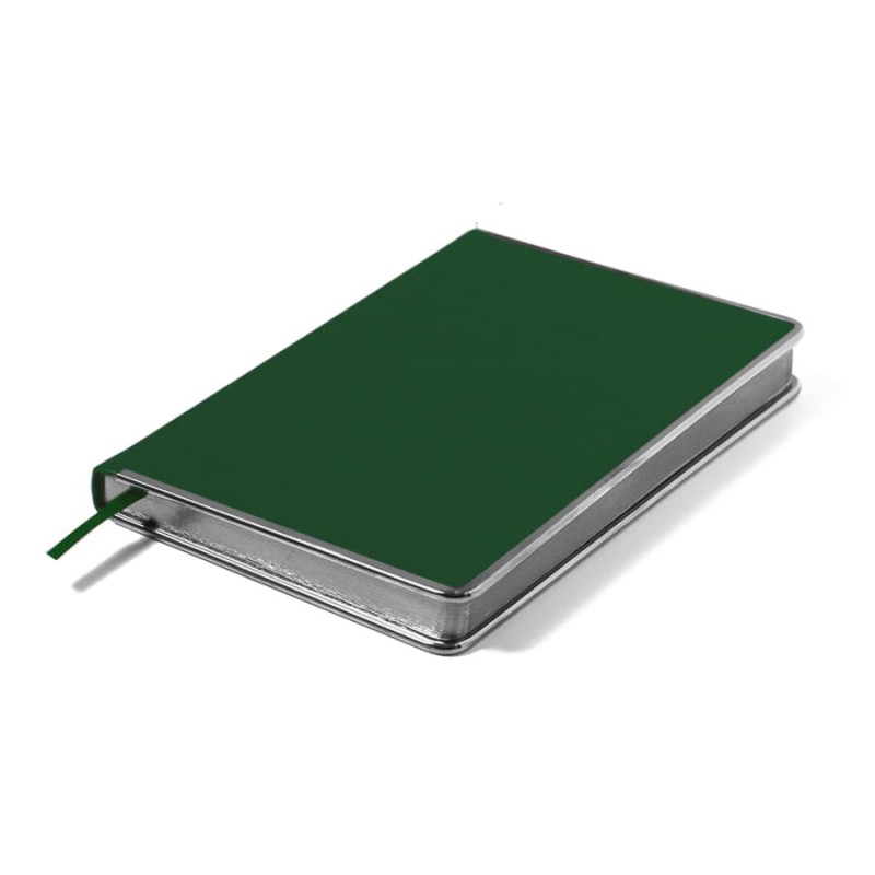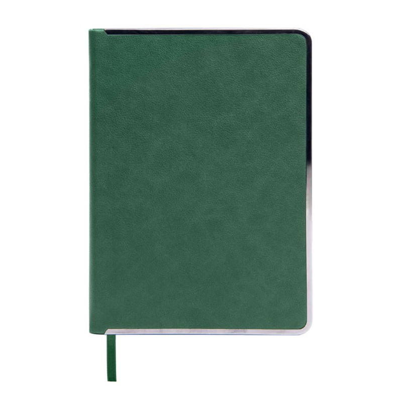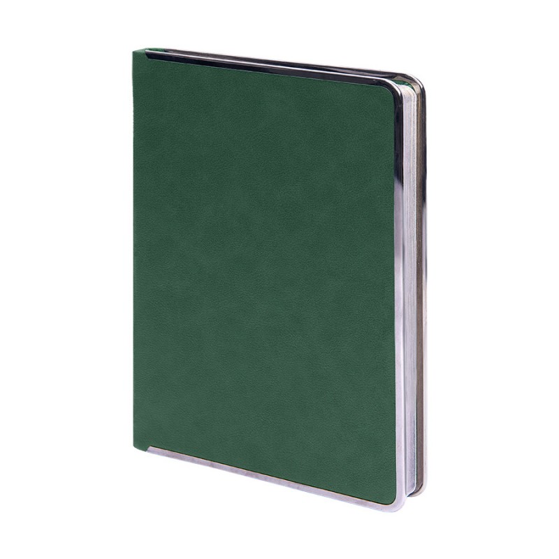 Классический ежедневник в твердом переплете. Обложка выполнена из искусственного материала зеленого цвета, имитирующего фактуру натуральной кожи. Металлическая окантовка по периметру. Обрез в цвет окантовки. Недатированный блок. Упакован ежедневник в крафтовый сливбокс.