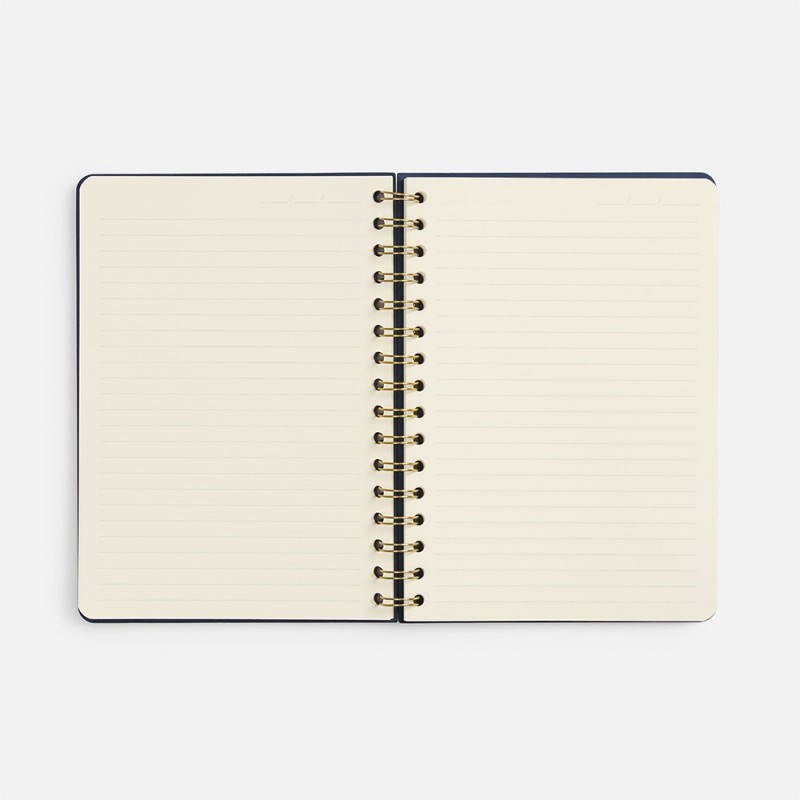 Классический синий тон обложки из мягкой искусственной кожи сочетается с элегантной золотой пружиной.