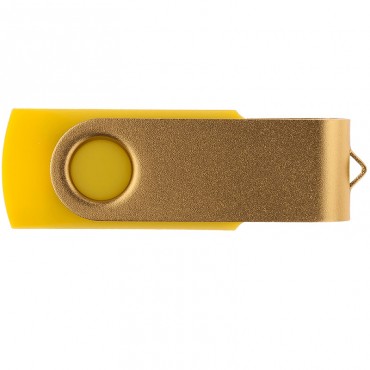 Флешка с пластиковым корпусом желтого цвета и золотистой металлической скобой. Корпус имеет покрытие софт-тач. Широкая цветовая палитра.
