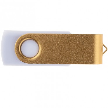 Флешка с пластиковым корпусом белого цвета и золотистой металлической скобой. Корпус имеет покрытие софт-тач. Широкая цветовая палитра.