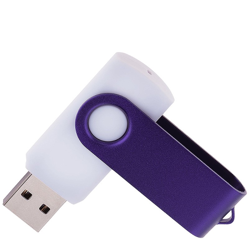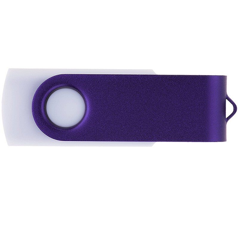 Флешка с белым пластиковым корпусом и металлической скобой фиолетового цвета. Корпус имеет покрытие софт-тач. Широкая цветовая палитра.