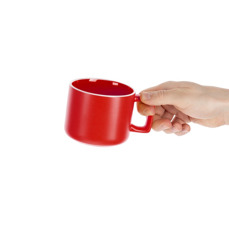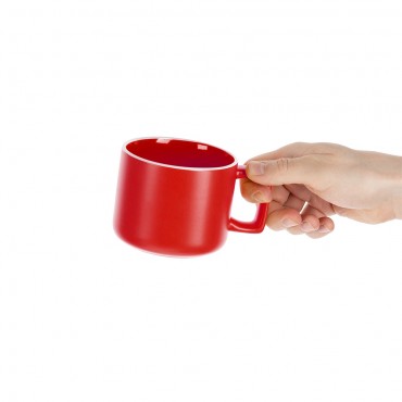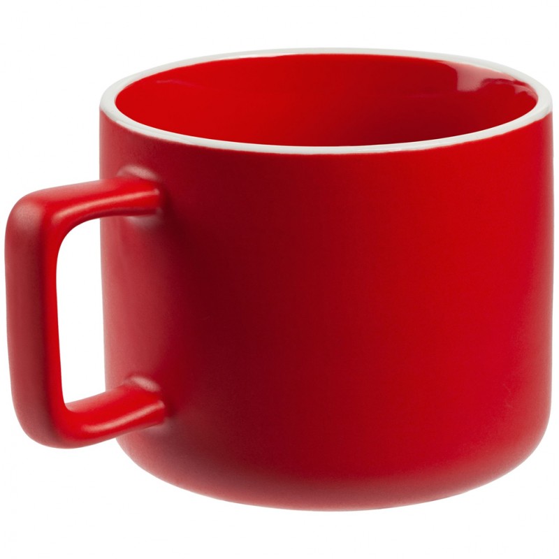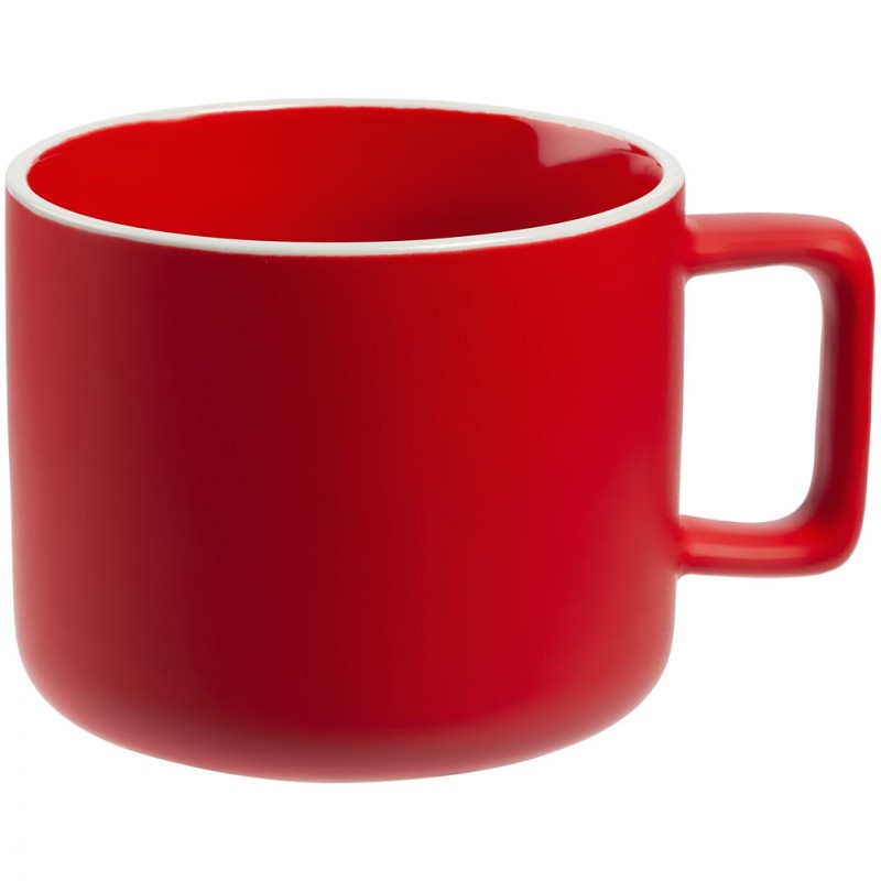 Большая кружка простой формы красного цвета в скандинавском стиле. Матовая глазурь снаружи и глянцевая внутри, белая линия по ободку.