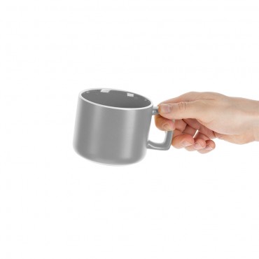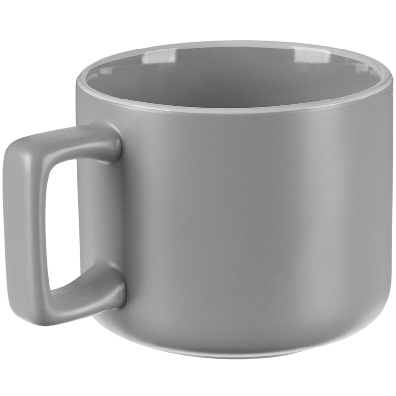Большая кружка простой формы светло-серого цвета в скандинавском стиле. Матовая глазурь снаружи и глянцевая внутри, белая линия по ободку.