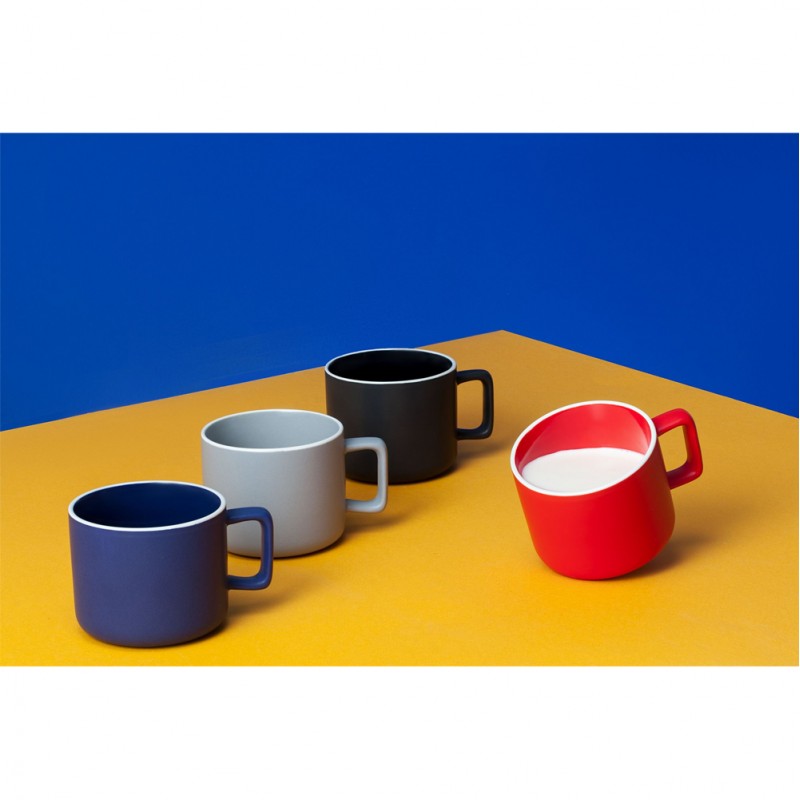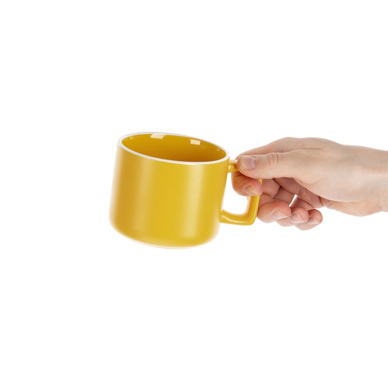 Большая кружка простой формы желтого цвета в скандинавском стиле. Матовая глазурь снаружи и глянцевая внутри, белая линия по ободку.