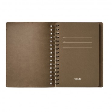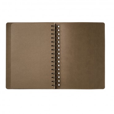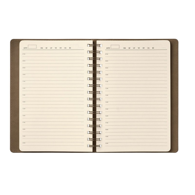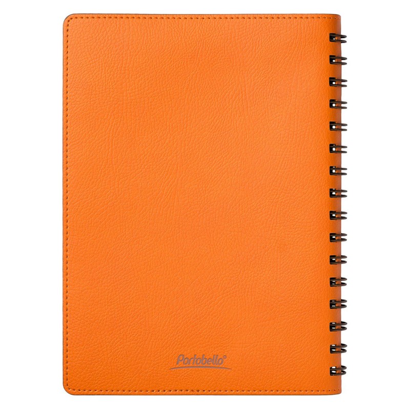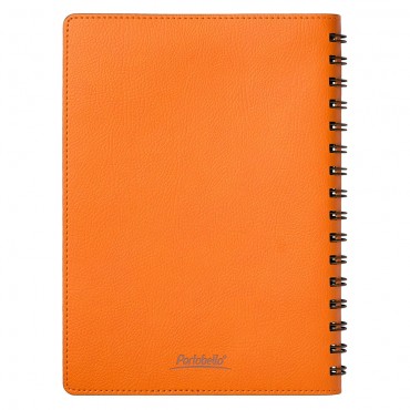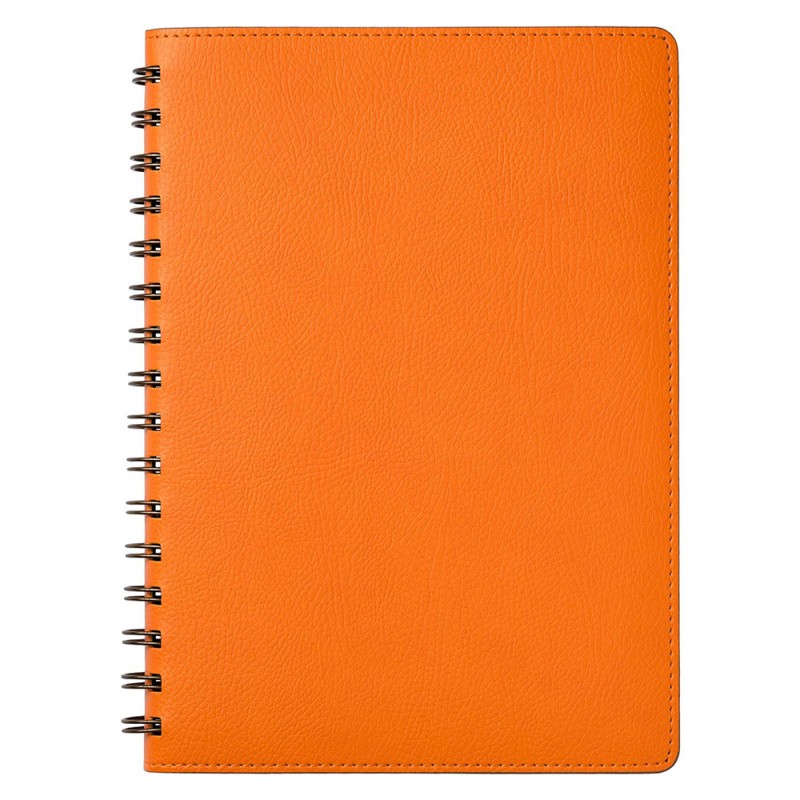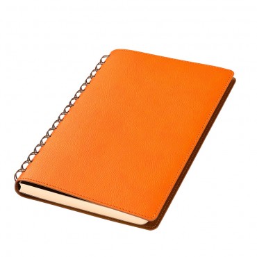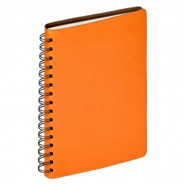 Ежедневник на полускрытой пружине в цвет внутреннего материала обложки. Гибкая обложка c форзацем контрастного цвета. Обложка выполнена из сшивки двух материалов. Внешний материал обложки – матовый, с некрупным рельефом под натуральную кожу. Цвет – оранжевый. Внутренний материал обложки – коричневого цвета. По периметру обложки выполнена прошивка в тон. Недатированный блок из тонированной шелковистой бумаги.
