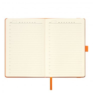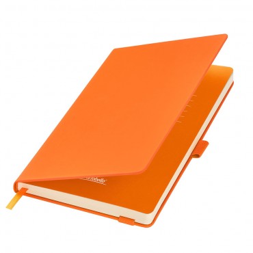 Ежедневники в твердом переплете с обложкой яркого оранжевого цвета. Обложка выполнена из искусственной кожи с эффектом Soft Touch. Форзац и нахзац - оранжевые. Недатированный блок с скругленными углами из шелковистой тонированной бумаги. Вертикальная фиксирующая резинка и петля для ручки. Яркая палитра цветов.