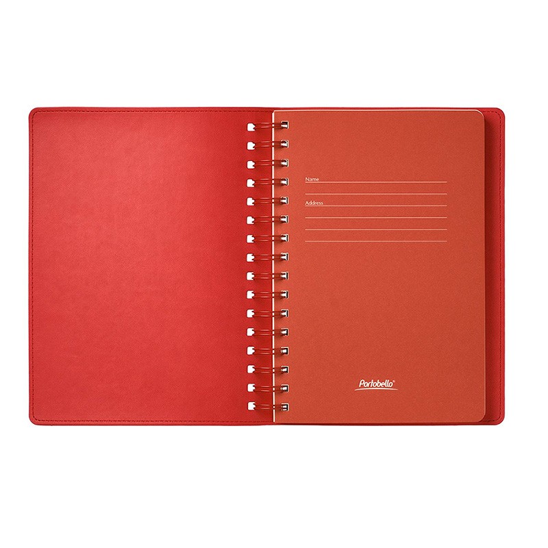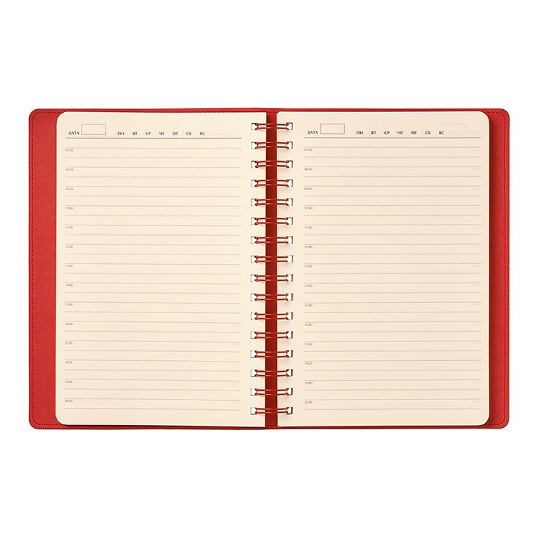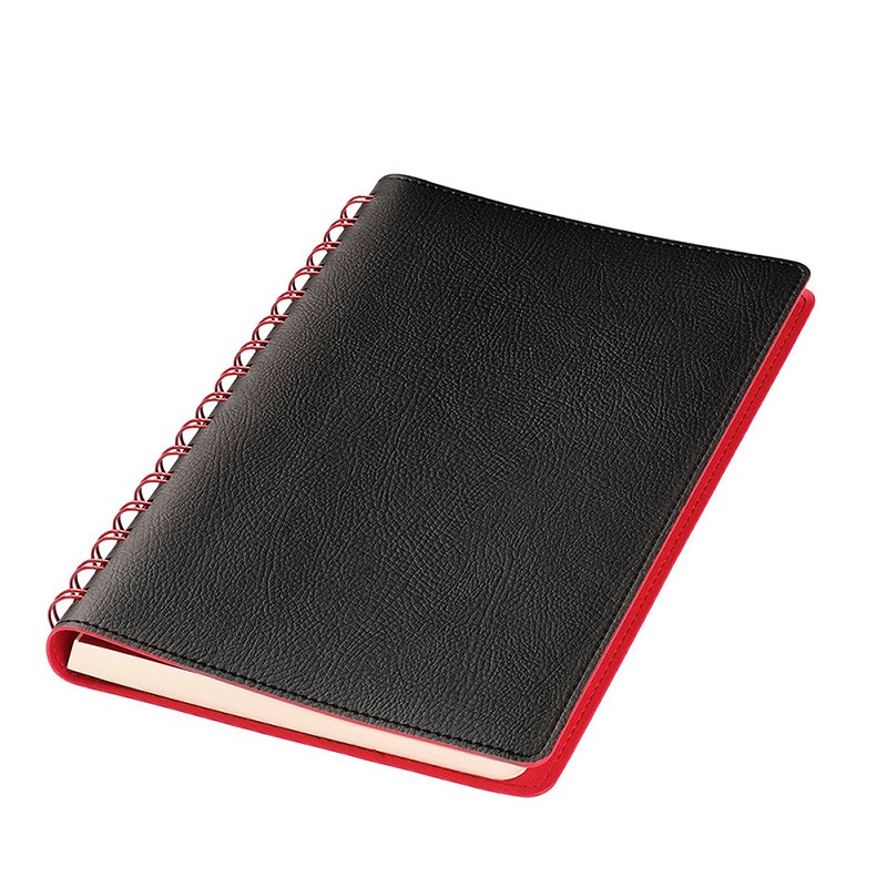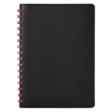 Ежедневник на полускрытой пружине в цвет внутреннего материала обложки. Гибкая обложка c форзацем контрастного цвета. Обложка выполнена из сшивки двух материалов. Внешний материал обложки – матовый, с некрупным рельефом под натуральную кожу. Цвет – черный. Внутренний материал обложки – однородного красного цвета. По периметру обложки выполнена прошивка в тон. Недатированный блок из тонированной шелковистой бумаги.