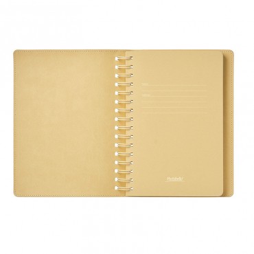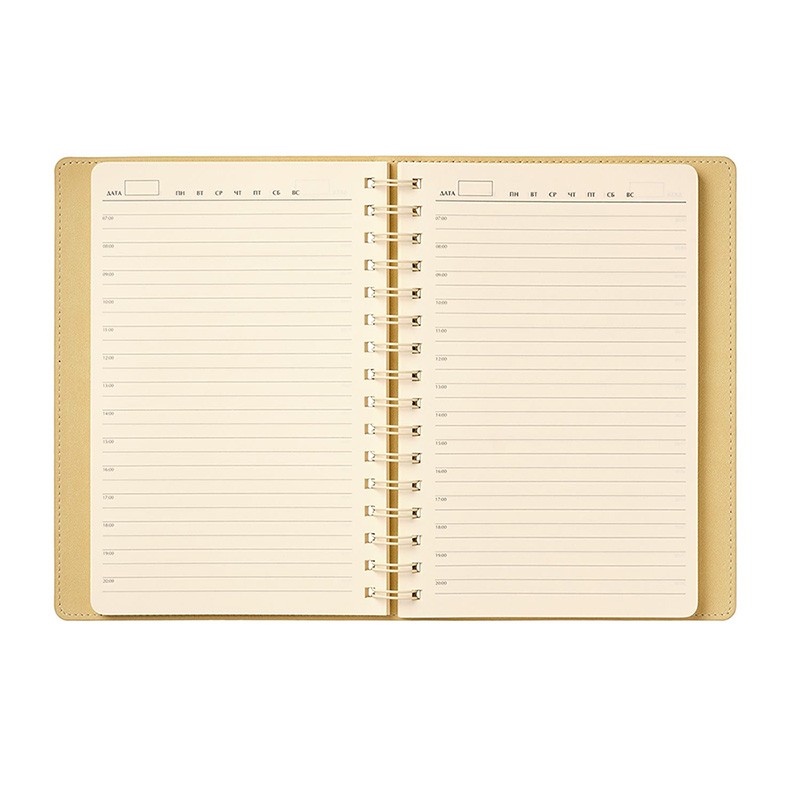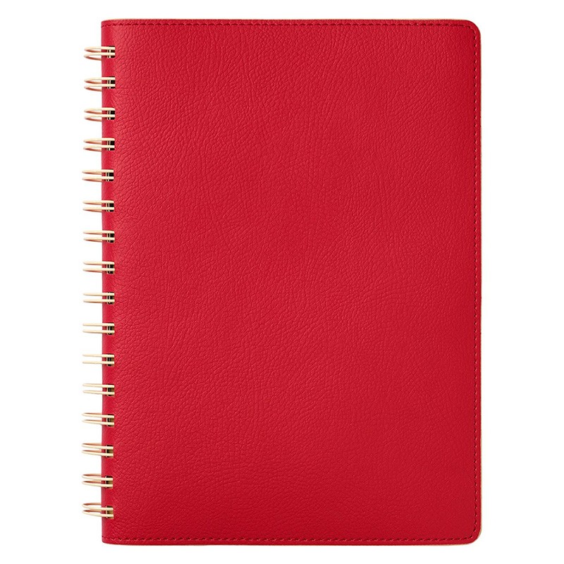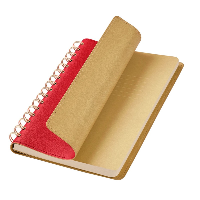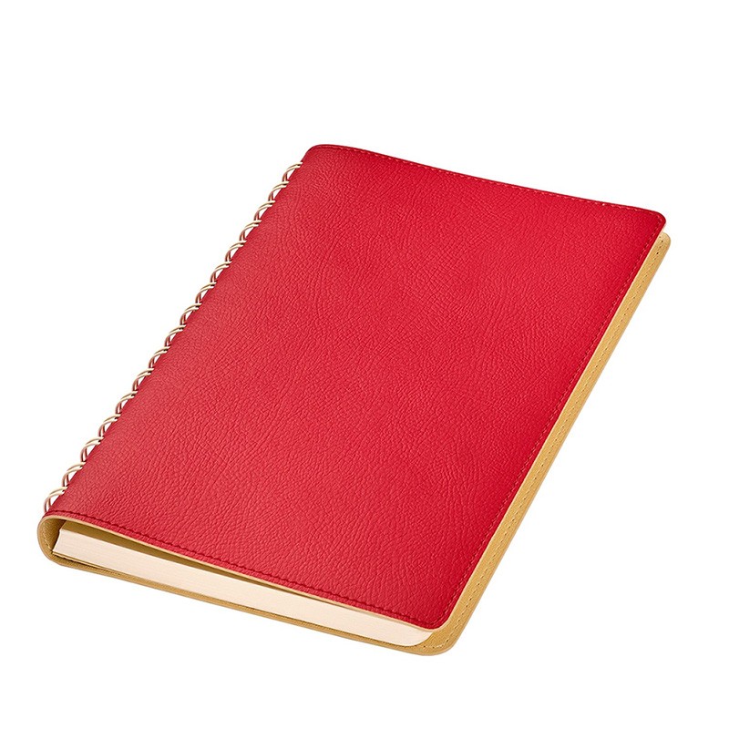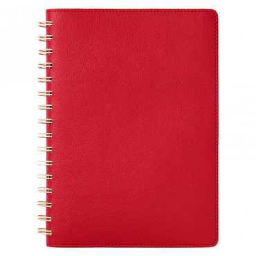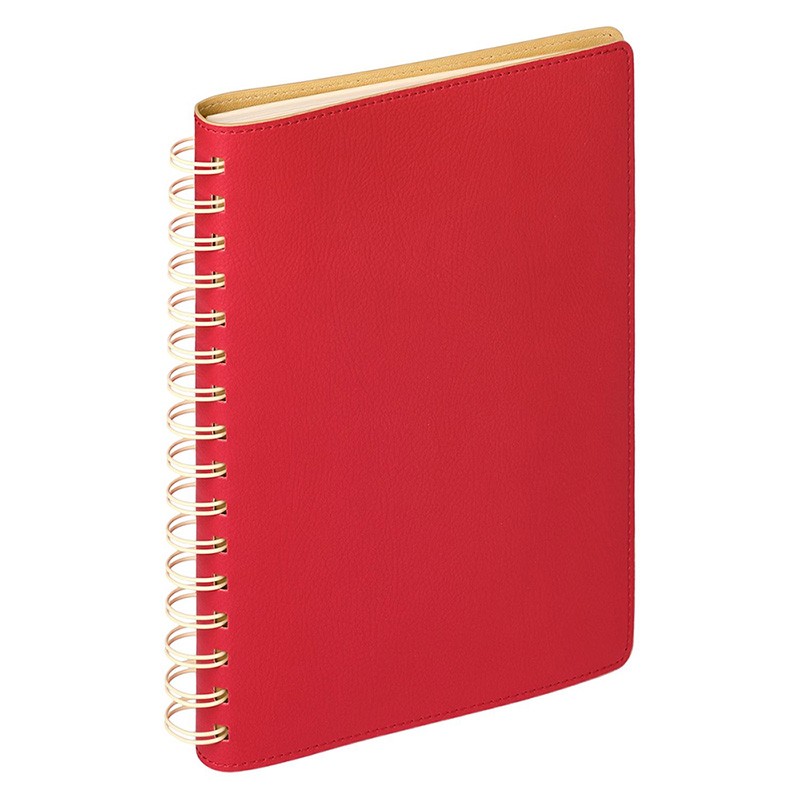 Ежедневник на полускрытой пружине в цвет внутреннего материала обложки. Гибкая обложка c форзацем контрастного цвета. Обложка выполнена из сшивки двух материалов. Внешний материал обложки – матовый, с некрупным рельефом под натуральную кожу. Цвет – красный. Внутренний материал обложки – однородного бежевого цвета. По периметру обложки выполнена прошивка в тон. Недатированный блок из тонированной шелковистой бумаги.