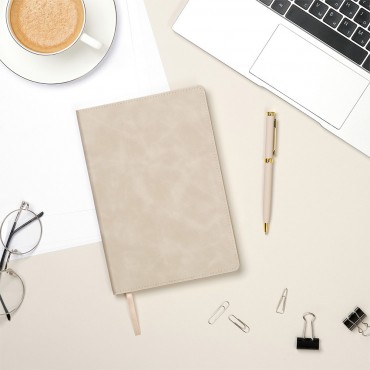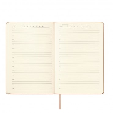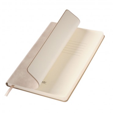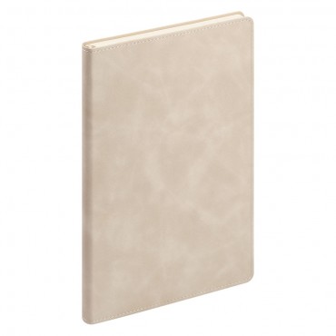 Изделие с гибкой обложкой, выполненной из высококачественной искусственной кожи. Цвет обложки бежевый. Поверхность ежедневника матовая с приятной шелковистой текстурой, напоминающей замшу. Прошивка по периметру в тон материала обложки. Форзац, нахзац и срез кремового цвета. Недатированный блок выполнен из шелковистой тонированной бумаги. Одинарное атласное ляссе 6 мм.