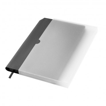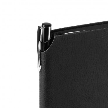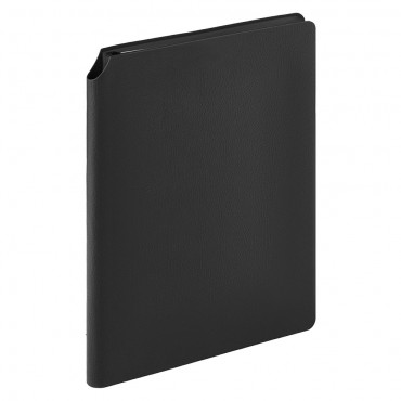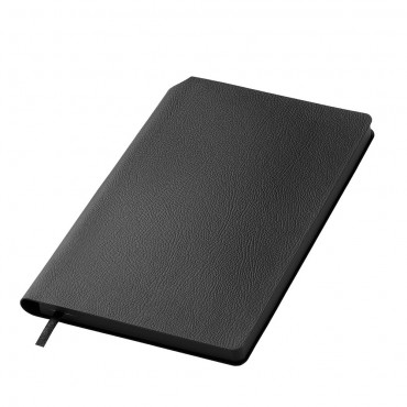 Ежедневник с гибкой обложкой, выполненной из высококачественной искусственной кожи. Поверхность ежедневника матовая, текстурированная с небольшим рельефом под натуральную кожу. Цвет обложки черный. В верхнем углу на корешке расположен держатель для ручки. Форзац, нахзац и срез - черного цвета. Недатированный блок выполнен из шелковистой тонированной бумаги. Одинарное атласное ляссе 6 мм в цвет обложки.
