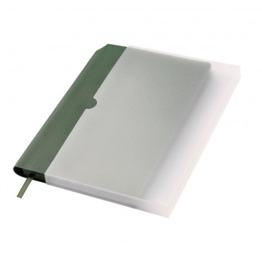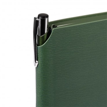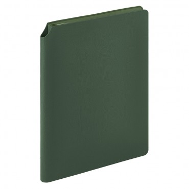Ежедневник с гибкой обложкой, выполненной из высококачественной искусственной кожи. Поверхность ежедневника матовая, текстурированная с небольшим рельефом под натуральную кожу. Цвет обложки зеленый. В верхнем углу на корешке расположен держатель для ручки. Форзац, нахзац и срез - зеленого цвета. Недатированный блок выполнен из шелковистой тонированной бумаги. Одинарное атласное ляссе 6 мм в цвет обложки.