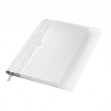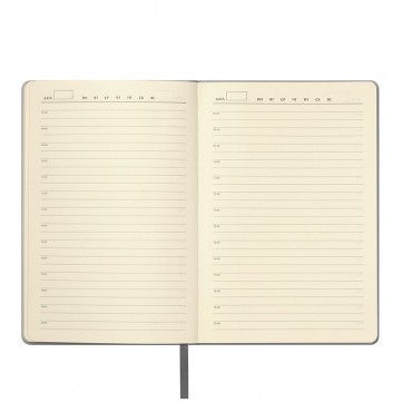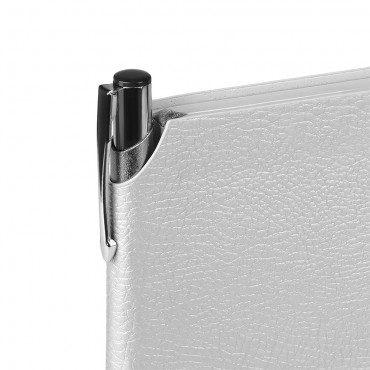 Ежедневник с гибкой обложкой, выполненной из высококачественной искусственной кожи. Поверхность ежедневника матовая, текстурированная с небольшим рельефом под натуральную кожу. Цвет обложки серебряный. В верхнем углу на корешке расположен держатель для ручки. Форзац, нахзац и срез - серебристого цвета. Недатированный блок выполнен из шелковистой тонированной бумаги. Одинарное атласное ляссе 6 мм в цвет обложки.