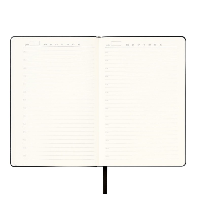 Черный недатированный ежедневник Spark — элегантный и практичный. Мягкая матовая обложка не пачкается и приятна на ощупь. Внутри — гладкие страницы кремового цвета, которые удобно писать. В комплекте — черная шелковая закладка-ленточка. Идеальный выбор для делового человека.