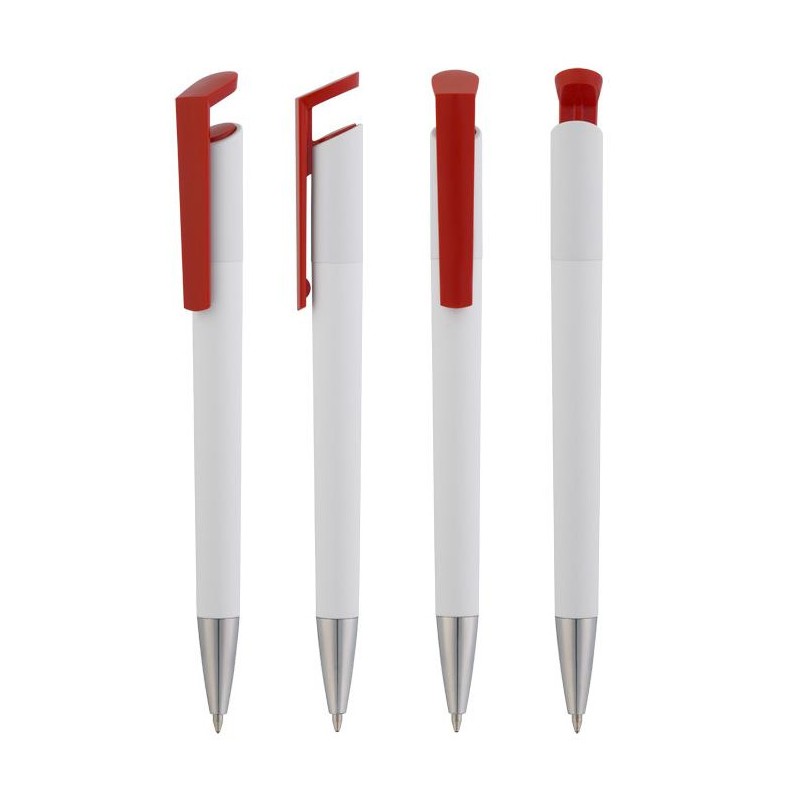 Ручка из пластика с оригинальным креплением клипа. Корпус ручки белый, клип - красного цвета.