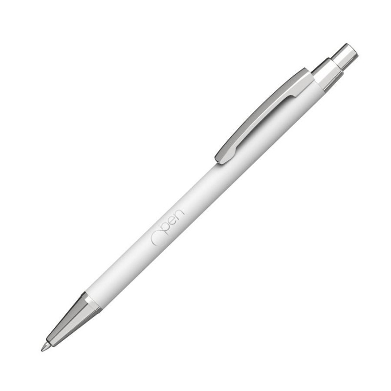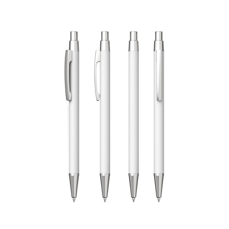 Изящная металлическая ручка с покрытием soft touch. Корпус ручки белый, отделка - серебристого цвета.