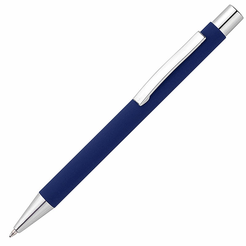 Ручка шариковая в металлическом корпусе с покрытием софт-тач. Корпус темно-синего цвета, наконечник и кнопка серебристые хромированные.