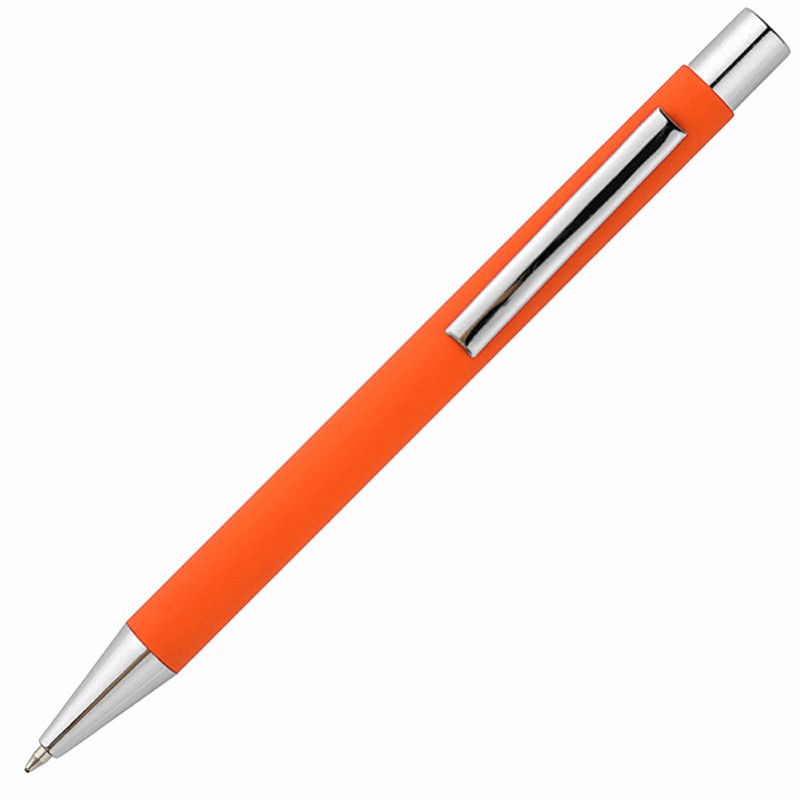 Ручка шариковая в металлическом корпусе с покрытием софт-тач. Корпус оранжевого цвета, наконечник и кнопка серебристые хромированные.