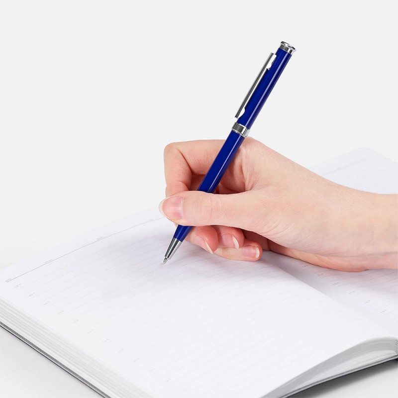 Металлическая ручка с глянцевым корпусом синего цвета и хромированными деталями. Изящное решение для тех, кто ценит совершенство в деталях. Это подарок вне времени и моды.