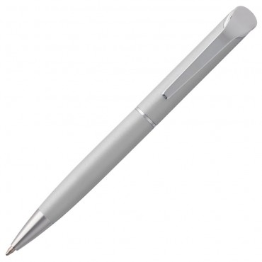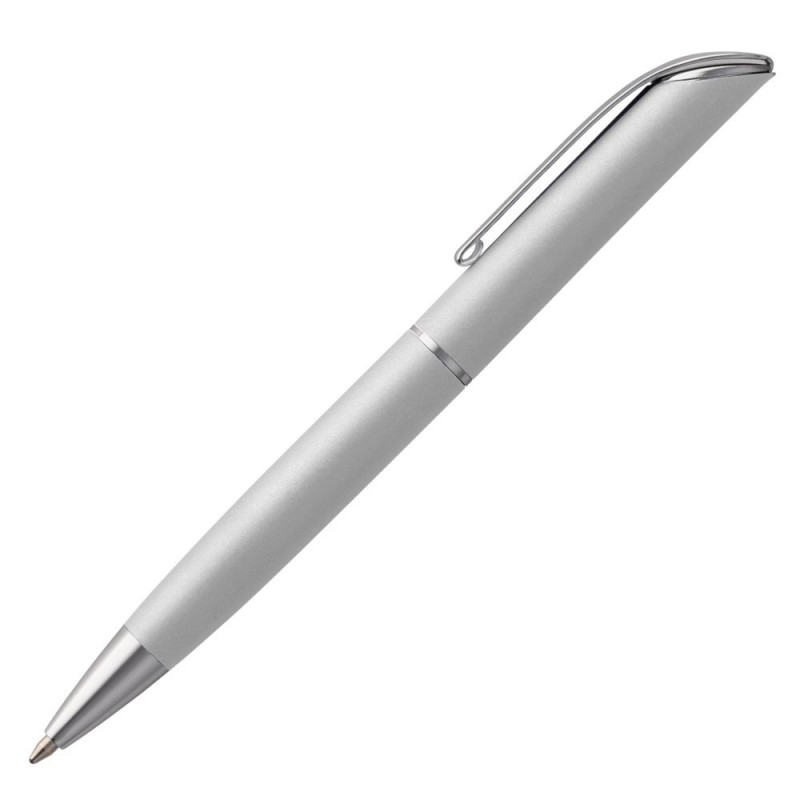 Ручка из металла с поворотным механизмом, матовым серым корпусом и лакированными серебристыми деталями.