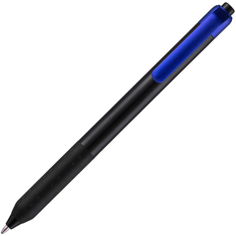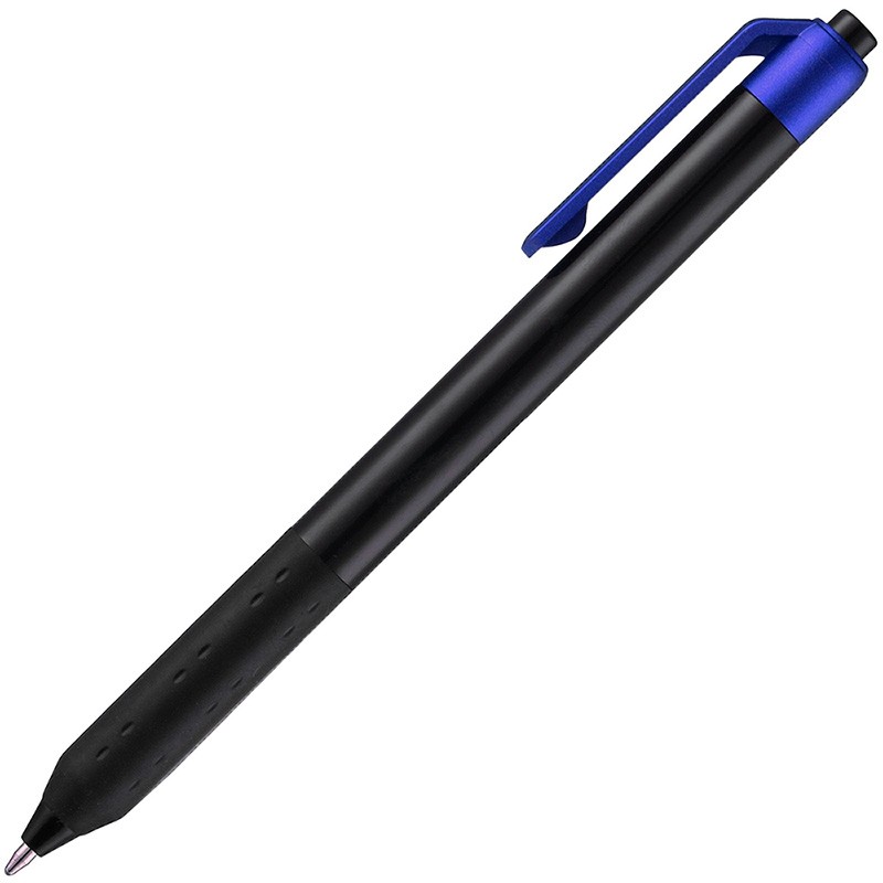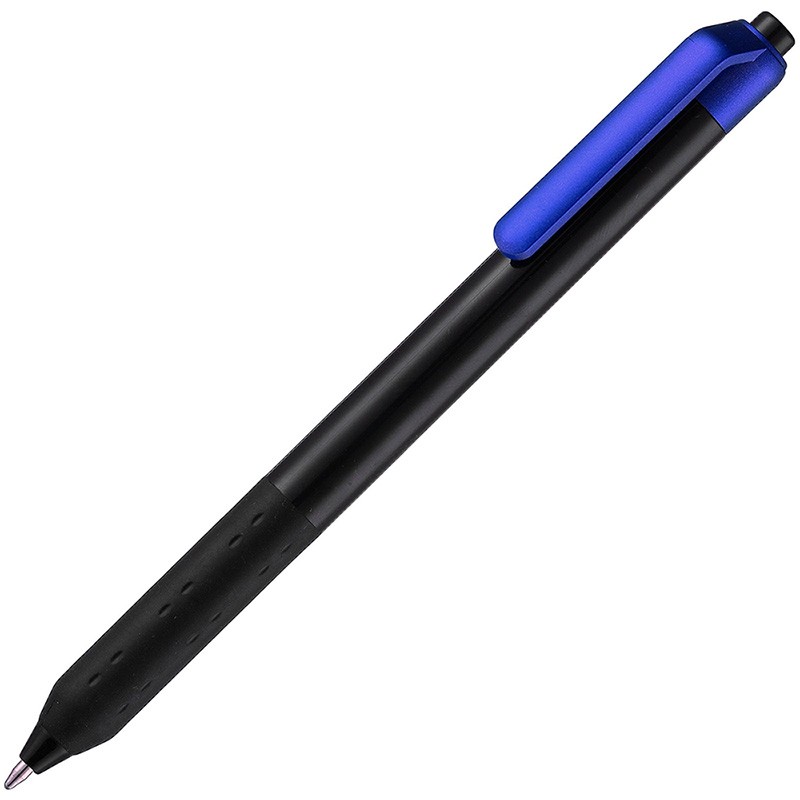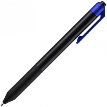 Пластиковая ручка в черном корпусе с резиновым упором и контрастным синим клипом с металлическим отливом.