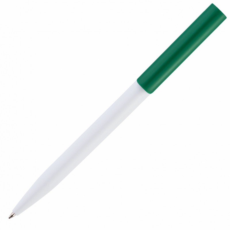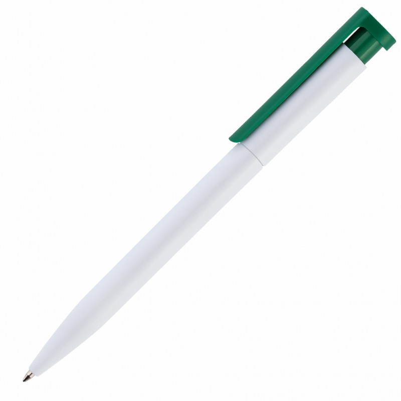 Бюджетная пластиковая ручка для рекламных акций. Корпус белого цвета, клип - зеленый.