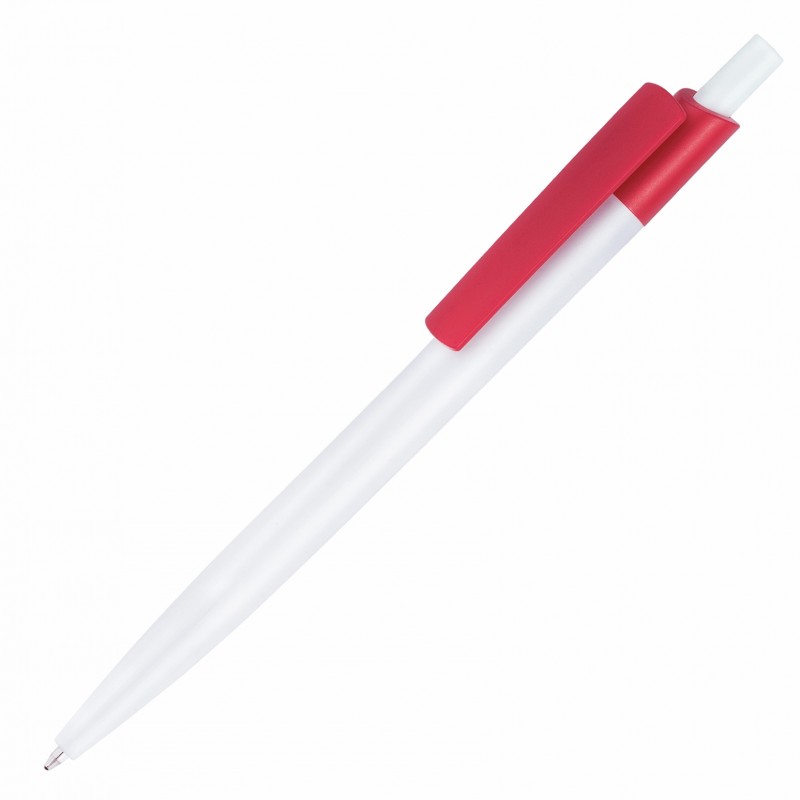 Бюджетная пластиковая ручка для рекламных мероприятий с широким клипом под логотип. Корпус ручки белого цвета, клип - красного.