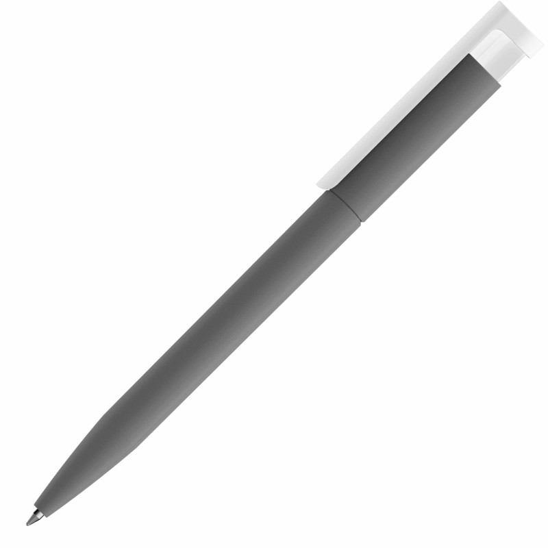 Стильная пластиковая ручка с покрытием софт-тач на корпусе. Корпус серого цвета. Клип белый с глянцевой поверхностью. Широкая палитра цветов.
