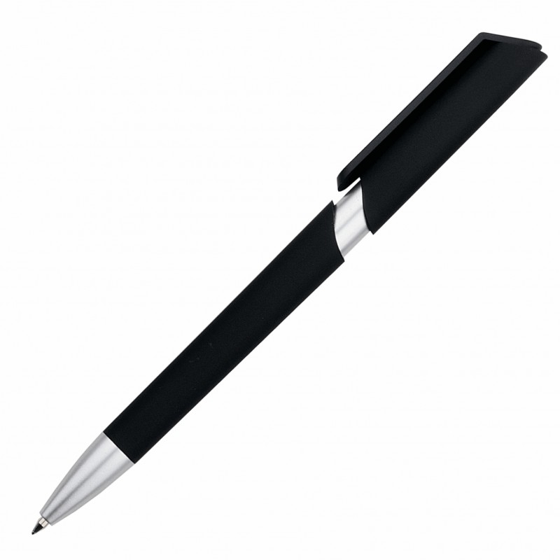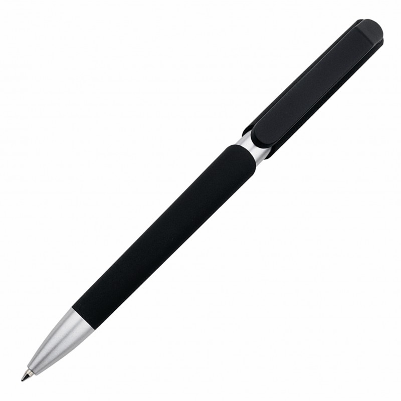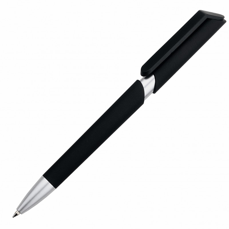 Пластиковая ручка с тактильно-приятным на ощупь корпусом черного цвета и серебристыми элементами.