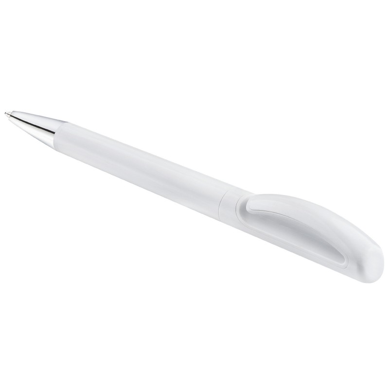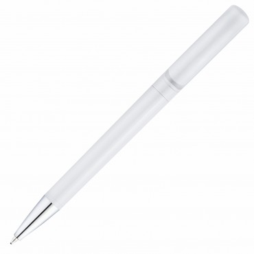 Пластиковая ручка с белым глянцевым корпусом украшена хромированным наконечником.