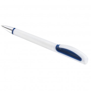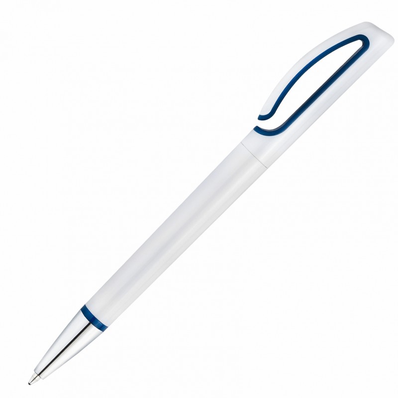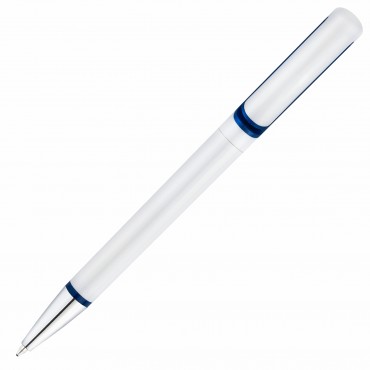 Глянцевая белая ручка из пластика дополнена хромированным наконечником и синими декоративными вставками.