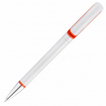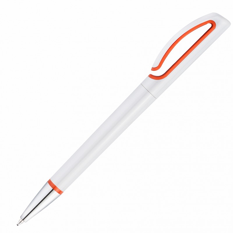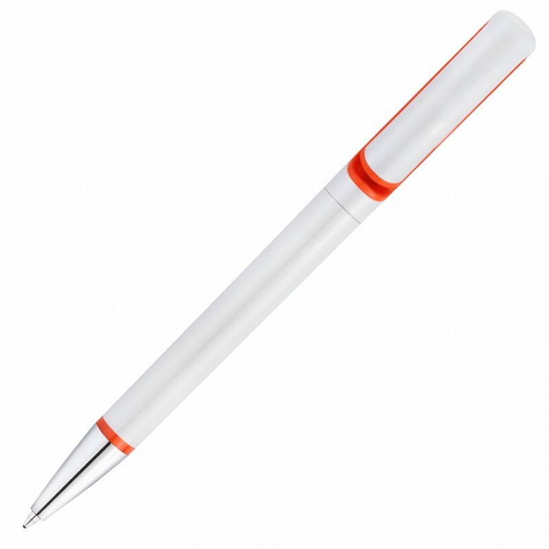 Элегантная пластиковая ручка в белом глянцевом дизайне с хромированными деталями и оранжевыми акцентами.