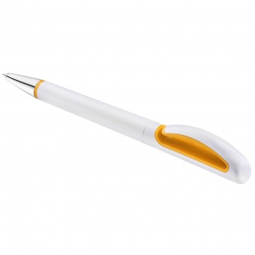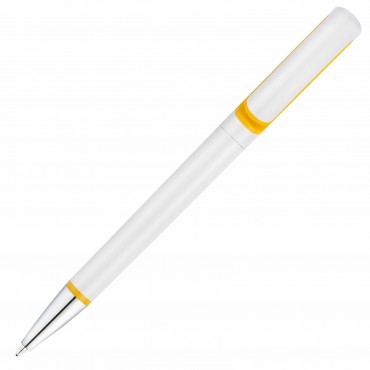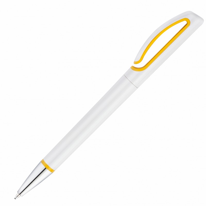 Элегантная пластиковая ручка в белом глянцевом дизайне с хромированными деталями и желтыми акцентами.