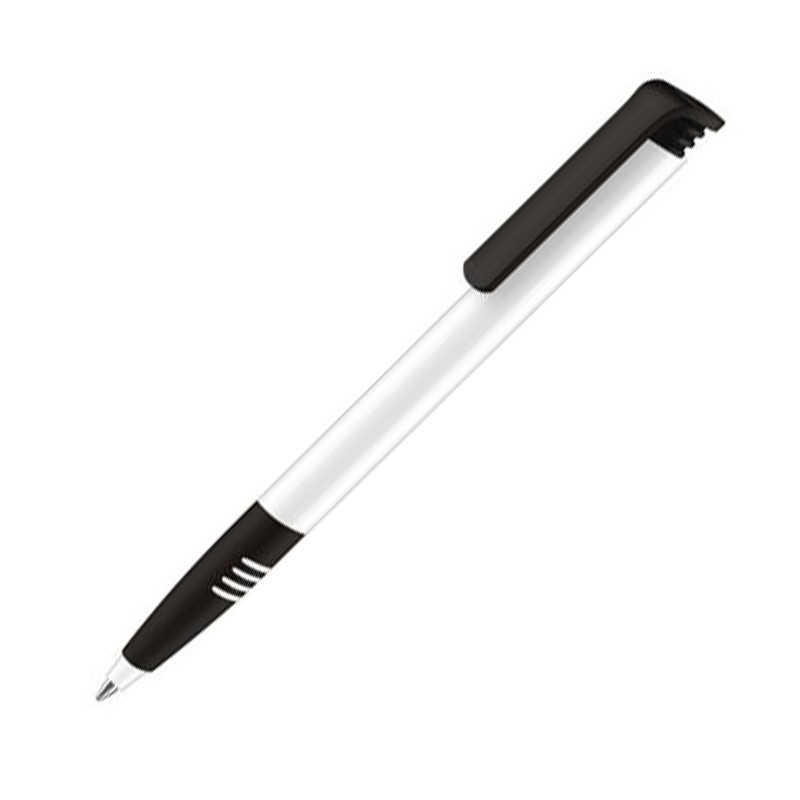 Пластиковая ручка с белым полированным корпусом, черным широким клипом и черной мягкой зоной грифа. Кнопочный механизм.