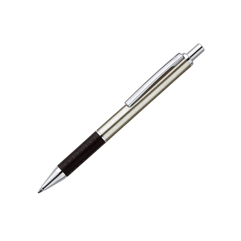 Ручка с корпусом из сатинированного металла и блестящими хромированными деталями, прорезиненная мягкая зона грифа черного цвета. Кнопочный механизм.