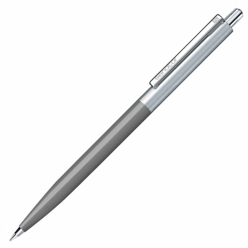 Авторучка с полированной поверхностью корпуса. Верхняя часть корпуса и детали выполнены из массивного металла. Нижняя часть - из пластика серого цвета.