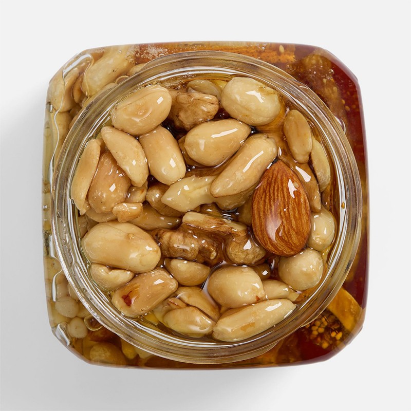 Предлагаем десерт для особых моментов. Богатая композиция из жареных орехов, ярких цукатов и полезных семян, залитая ароматным медом, обладает не только изумительным вкусом, но и безупречным внешним видом, что делает его превосходным вариантом для презента.